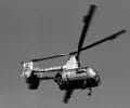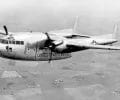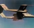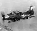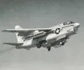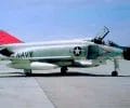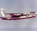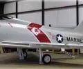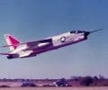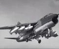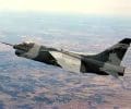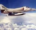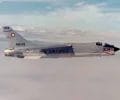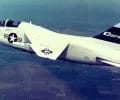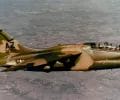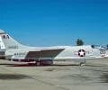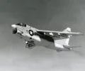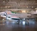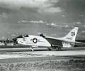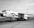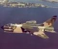 A left front ground view of an A-7C Corsair II aircraft with a Skipper Laser-Guided Bomb (LGB) mounted under its wing.